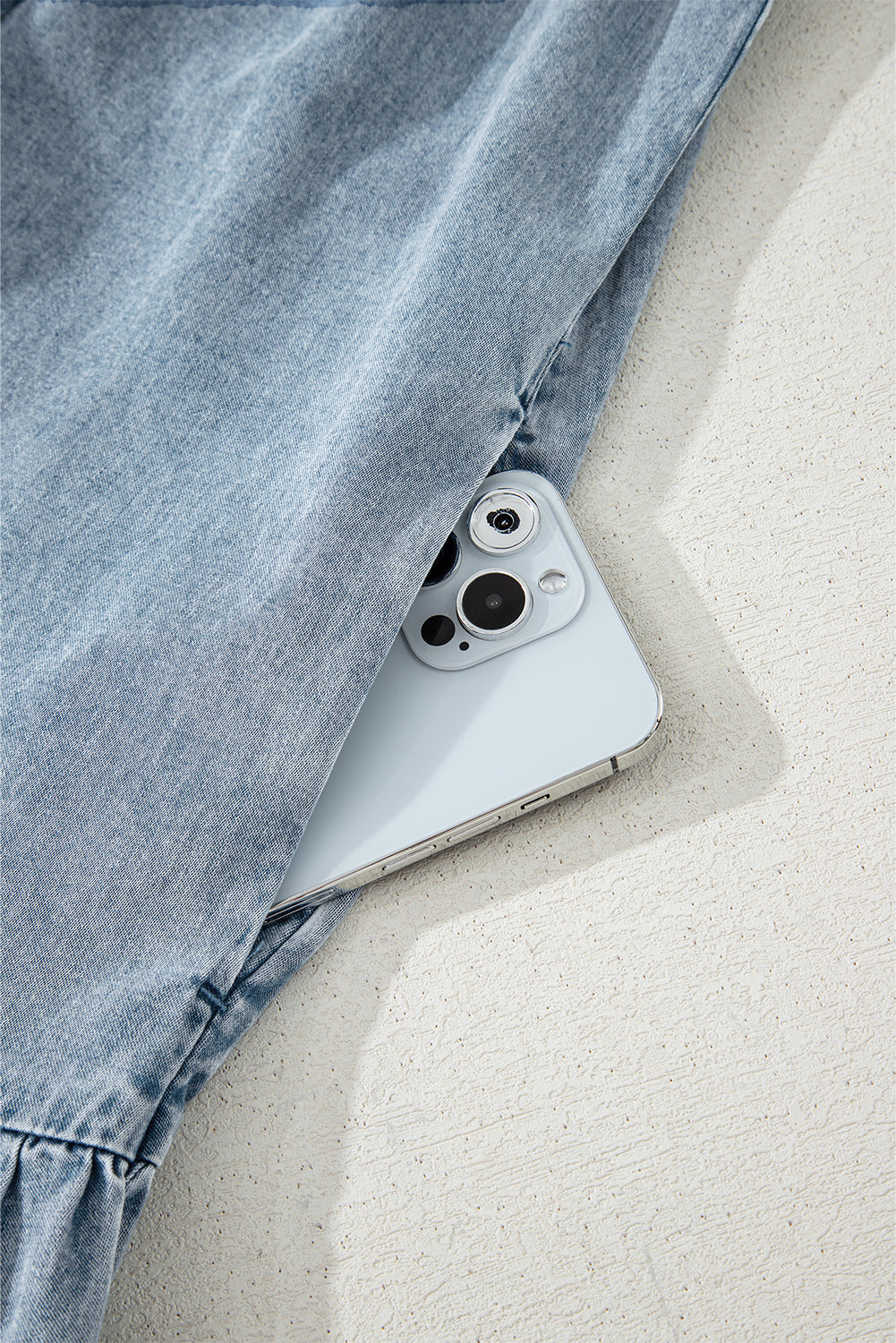 Sleeveless design and chambray fabric offer a light, breezy feel.