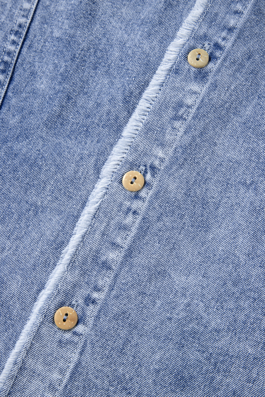 Beau Blue Wash Long Sleeve Button Up Raw Hem Pocketed Denim Dress