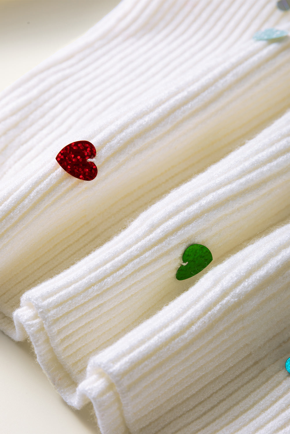 Beige Sequin Heart Shape Waffle Knit Round Neck Sweater
