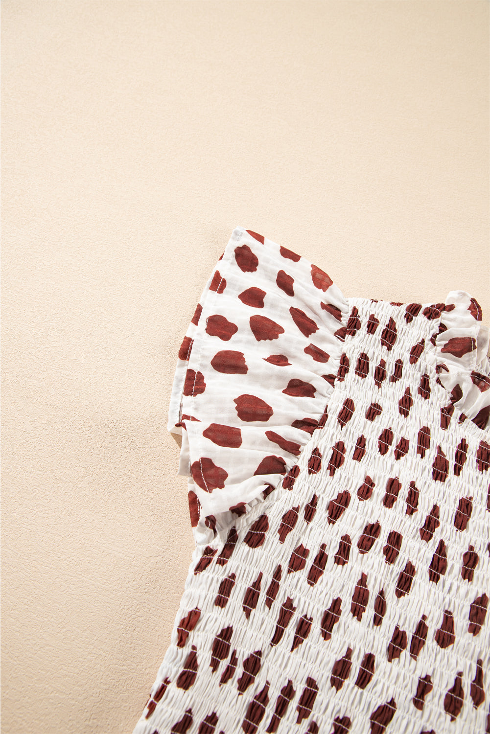 Brown Abstract Printed Flutter Sleeve Smocked Bodice Short Dress