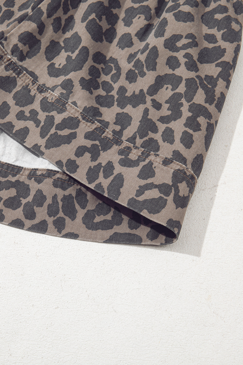 Brown Denim Leopard Printed Short Puff Sleeve Mini Dress