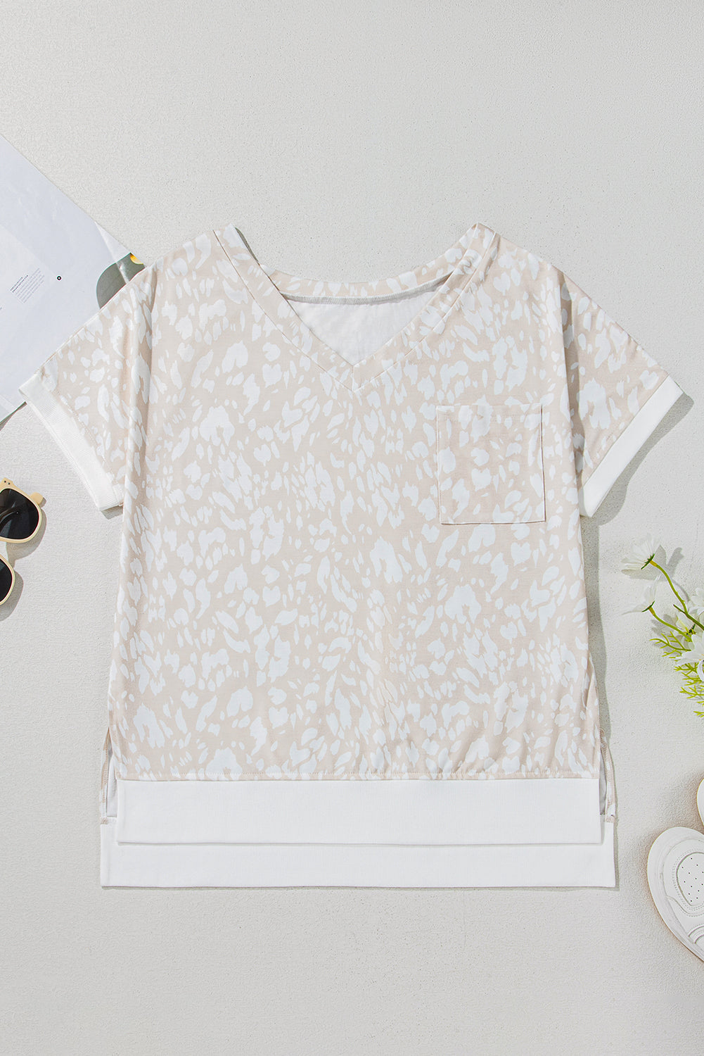 This chic tee features a bold leopard print with a V-neckline and side slits.