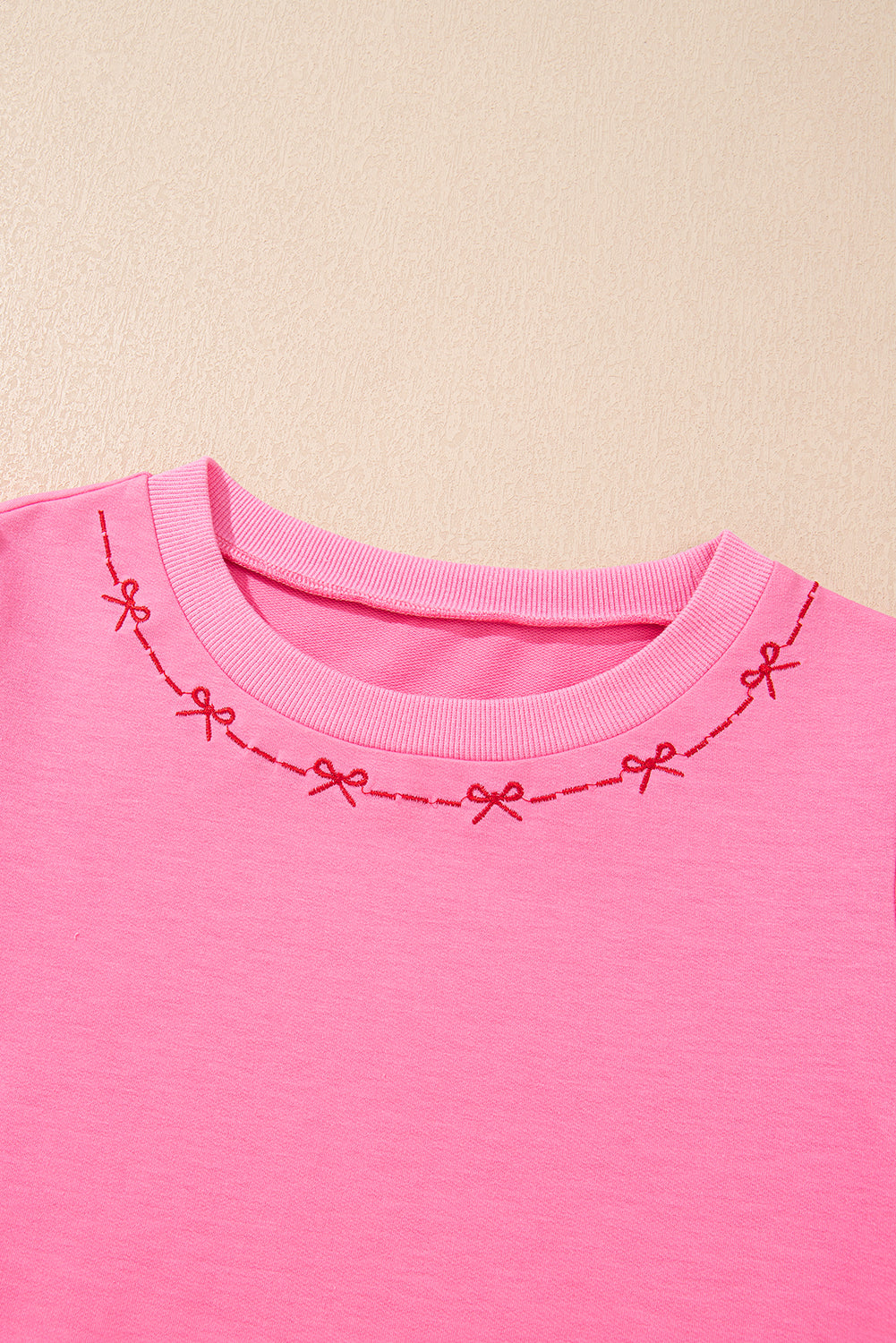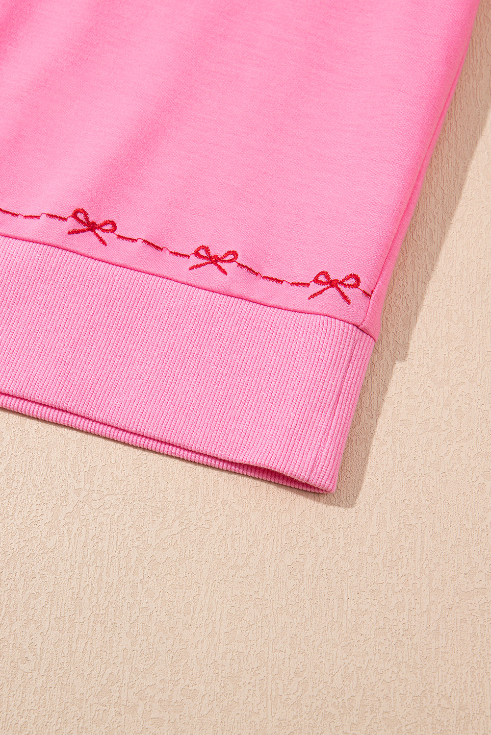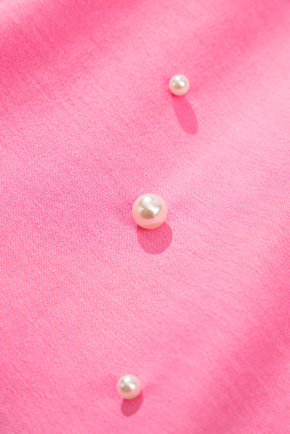Pink Contrast Bow Trim Pearl Puff Sleeve Blouse and Skort 2pcs Set
