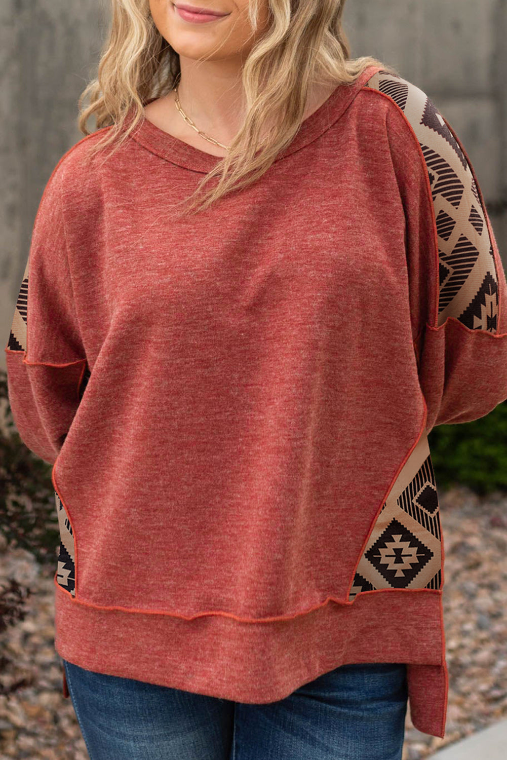 Redwood Burl Aztec Patchwork Drop Shoulder Plus Size High Low Sweatshirt
